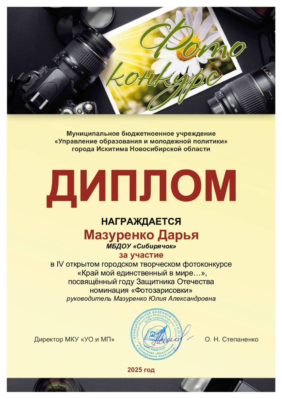 Диплом участника открытого творческого фотоконкурса "Край мой единственный в мире..."посвященныйГоду Защитника Отечества Мазуренко Дарьи